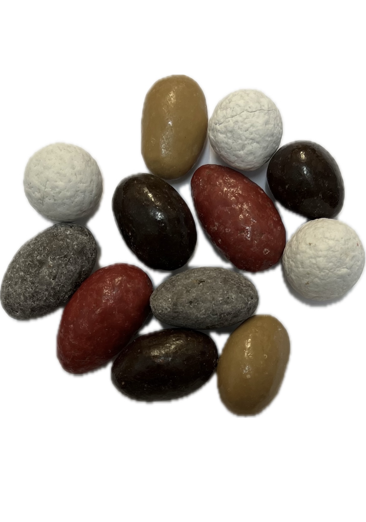 Un joli assortiment gourmand de douceurs au chocolat noir ! Principalement composé de noisettes et d’amandes enrobées de chocolat noir, ainsi que bien d’autres délices…