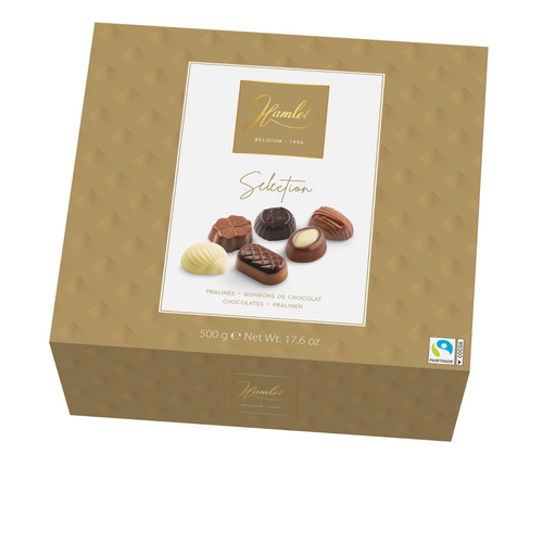 Découvrez l’élégance du chocolat belge à travers l’assortiment “Sélection” de la maison Hamlet. Présenté dans une boîte raffinée de 500 grammes, cet assortiment incarne tout le savoir-faire chocolatier belge. Vous y retrouverez une large variété de pralines, fourrées avec des ganaches onctueuses, des crèmes fondantes ou des éclats croustillants, enrobées de chocolat noir, au lait ou blanc.