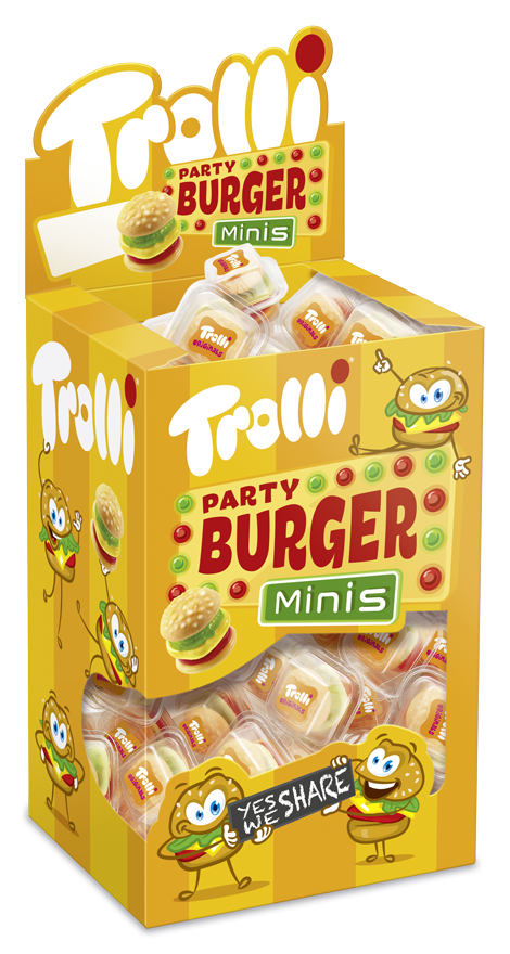 Découvrez les célèbres Mini Burgers Trolli en présentoir de 80 pièces. Bonbons gélifiés ludiques et savoureux !