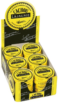 Le Cachou Lajaunie est une petite pastille carrée de couleur noire à la réglisse, vendue dans une boîte métallique jaune et ronde.