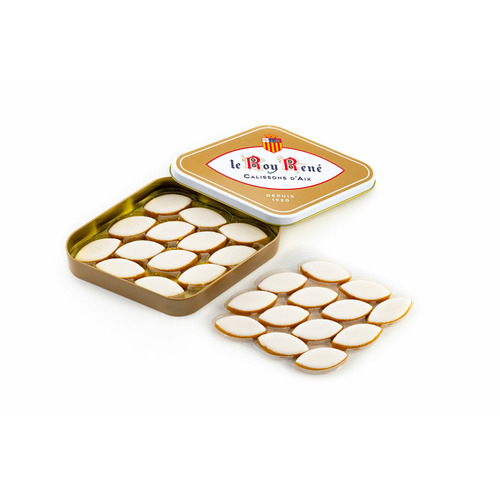 Emblèmes gastronomiques de la Provence, craquez pour la douceur sucrée des véritables calissons d’Aix dans leur fameuse boîte métal signé Roy René.