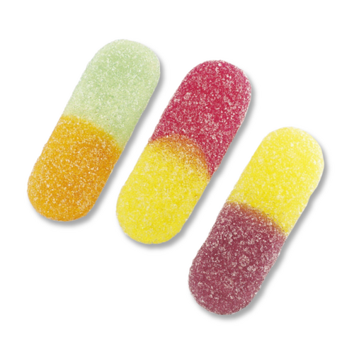 Ingrédients : Sucre, sirop de glucose, gélatine, acidifiants (acide citrique, acide malique), arômes naturels, concentrés de fruits et légumes (carotte, cassis, radis, pomme, hibiscus), agents d’enrobage (huile végétale, cire de carnauba), colorants (E100, E120, E133, E160c).