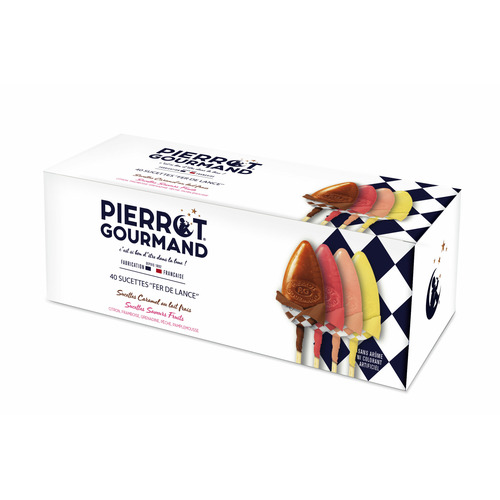 Sucettes aromatisées : sucre, sirop de glucose, acidifiant: acide citrique, arômes naturels de fruits (pêche, citron, pamplemousse rose, framboise, cassis et vanille), concentrés colorants de paprika, carotte, pomme, potiron, radis, citron et cassis.