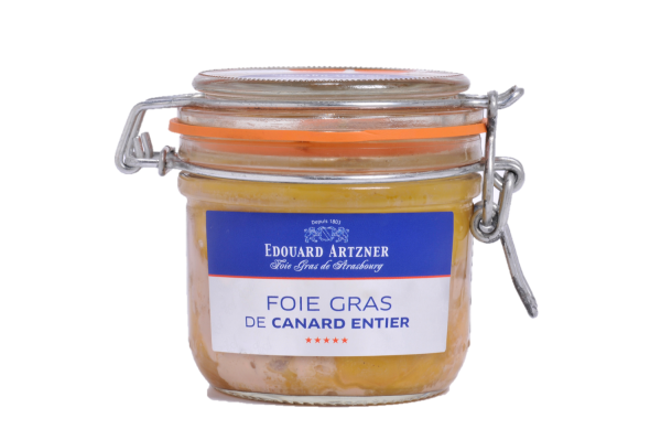 Le foie gras de canard est caractérisé par un goût plus puissant et affirmé que celui d’oie. Ce foie gras de canard entier Edouard Artzner se distingue particulièrement car il s’agit d’un lobe de foie gras entier extra frais, déveiné et assaisonnée, puis est cuit à 110°C à cœur.