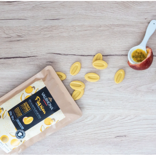 Pâte de chocolat Valrhona parfumée passion 250 g – texture lisse et saveur fruitée intense, idéale pour pâtisserie et desserts créatifs.