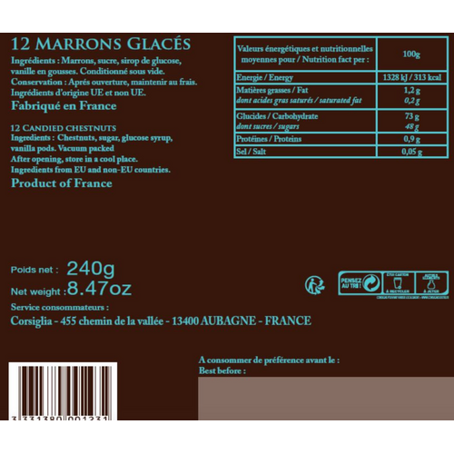 La qualité des marrons glacés Corsiglia est légendaire. Ils sont ici présentés sous atmosphère contrôlée, afin de pouvoir en profiter toute l’année avec une conservation facilitée.