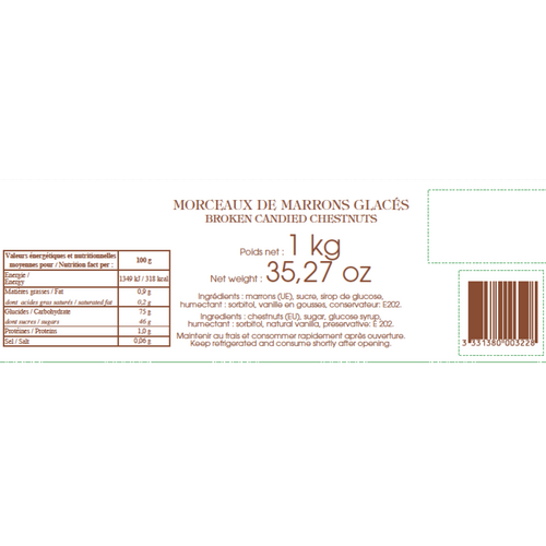 Chaque marron est choisi avec soin pour sa qualité et sa texture fondante. Ensuite, il suit un confisage lent qui préserve son goût naturel. Les morceaux sont glacés avec un sirop légèrement parfumé à la vanille. Ainsi, la douceur du marron est parfaitement mise en valeur.
